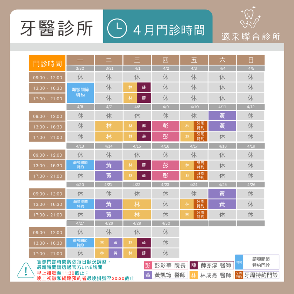 【4/13、4/20、4/27】 ★顳顎關節特約★ 13:00-16:30 |