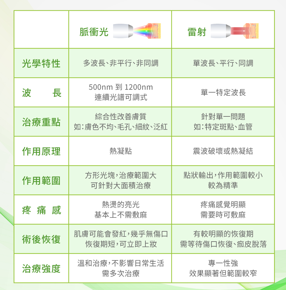 整體來說,雷射適合局部精準治療,脈衝光適合大範圍的膚質調理。脈衝光可針對不同的膚質問題,選擇不同的光波長進行治療的特性,比起雷射治療更加溫和不傷膚。