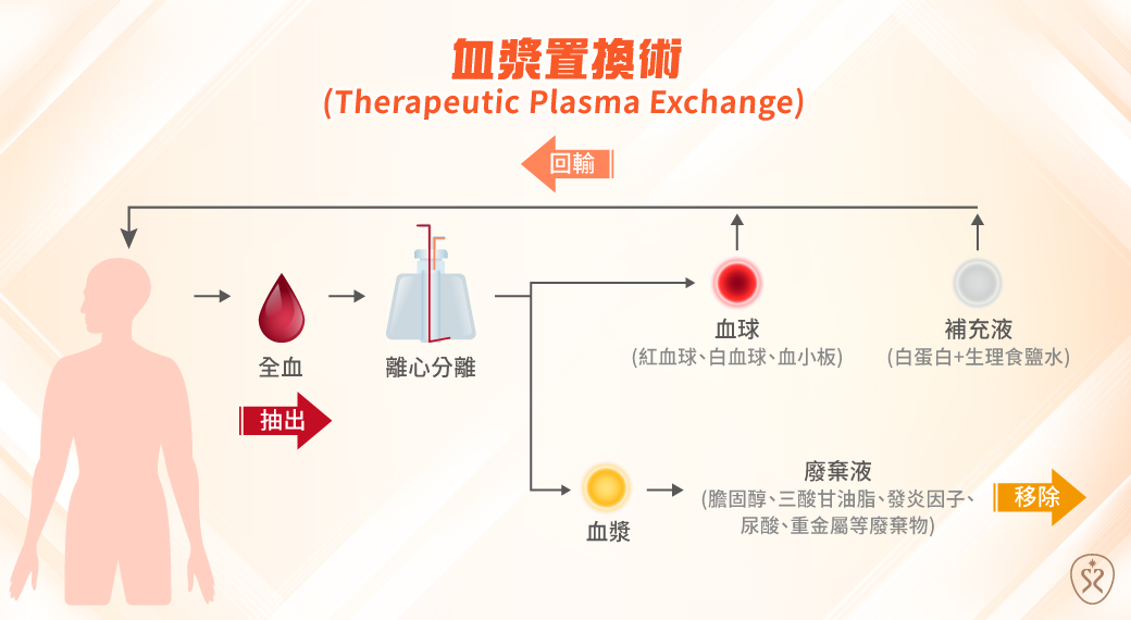 血液淨化(血漿置換) = 針對「血漿中致病因子」進行清除,多用於免疫或急性疾病控制。