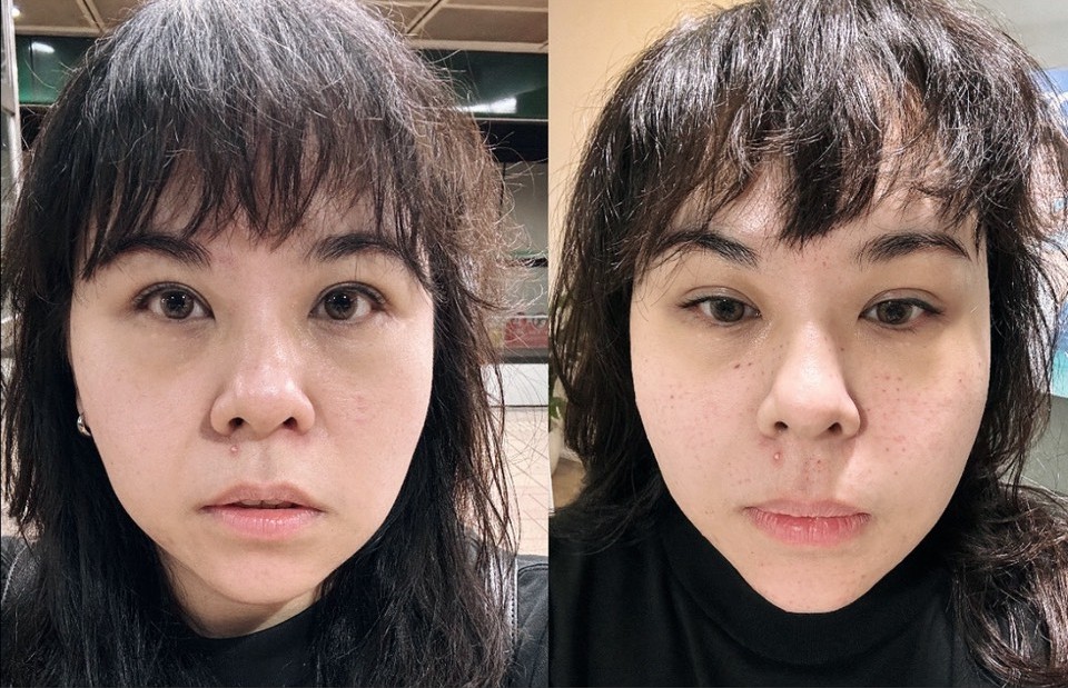 這是當天施打修秘水光電波前、後的照片,可以忽略我的痘痘!!那個v臉有點出來了,臉上用了高濃度活性因子消紅恨快,但還有些水光針孔的痕跡,醫生說大約一週內會慢慢消退;電波則是三個月後效果更佳,讓我們期待,三個月後的分享。