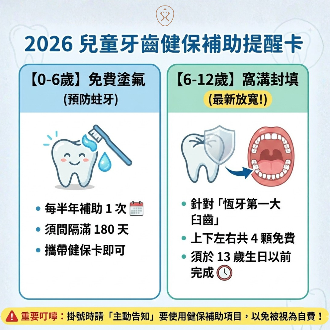 重大更新: 施作年齡已由原先的 6 至 9 歲,修正放寬為 6 至 12 歲,讓換牙較慢的孩子也能享有保障。(衛福部公文連結)