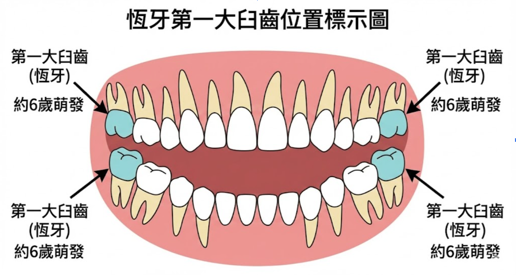 ✦護牙重點: 這是恆牙(特別是第一大臼齒)萌發的關鍵期。大臼齒咬合面溝紋深,容易卡殘渣導致蛀牙,必須儘早封填。